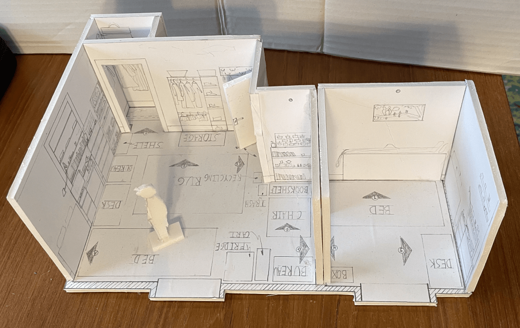 This project was for Gettysburg’s scenic design class. We were to draft and create a model of our dorm rooms. It is in 1/2″ scale.