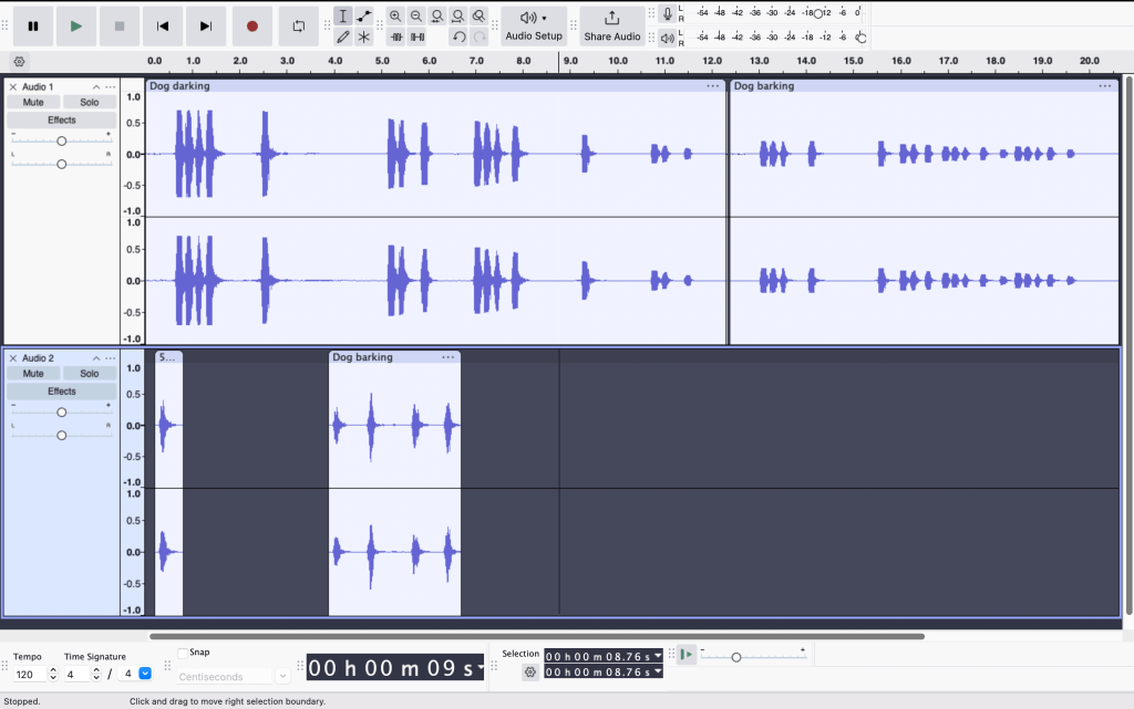 This is one of the sequences of shots and Rhett barking that interrupts the first scene. All of the barking and shots were from a speaker placed on SL to position the sound in the space.