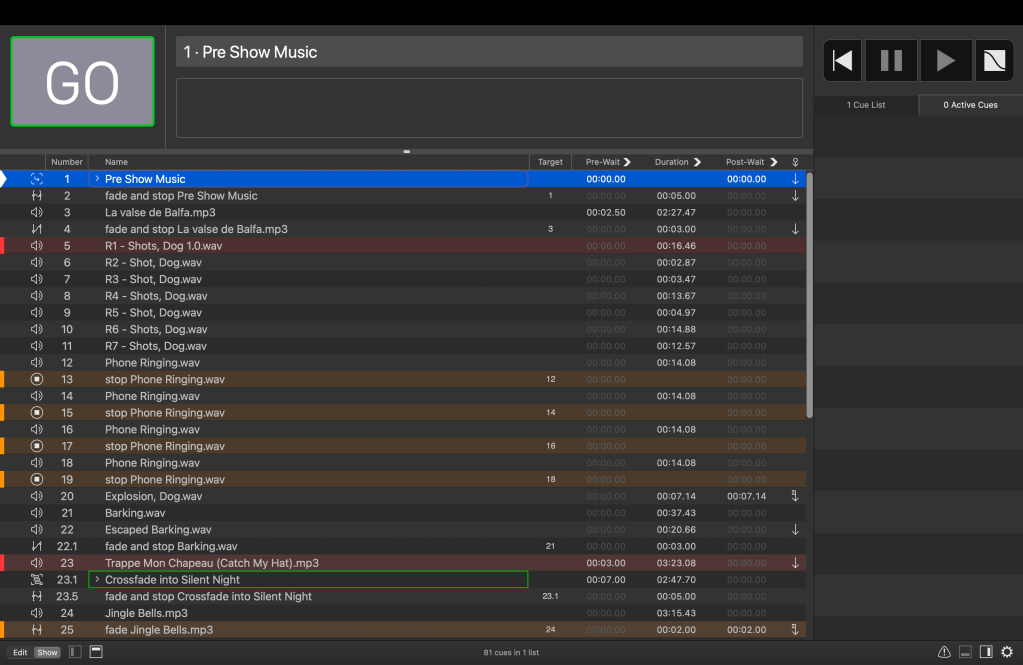 I served as the sound designer for this production. This production used localized sound for many of the cues. I only had access to the free version of QLab, so the routing of the localized sounds was a bit complicated. Since the audio routing of QLab can’t be edited in the free version, I had to use both an aux cable and a USB cable to get enough channels and use each cable for two locations. The up-stage speaker would only be used in the first scene, so I used the aux cable to carry that signal and the House signal. The board operator had to crossfade between the Mains and the Aux 1 mix at the end of the first scene, but otherwise that cable would only be used for the House.
